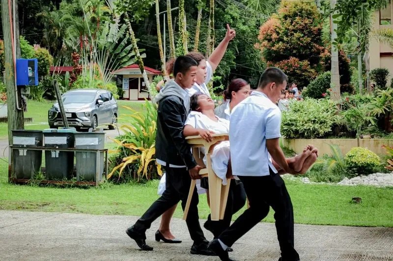 Mahasiswa memindahkan seseorang yang membutuhkan perawatan medis setelah gempa bumi magnitudo 7,5 di Provinsi Agusan Del Sur, Filipina, 10 Oktober 2025. (Xinhua/HO-Torch Mindanao)